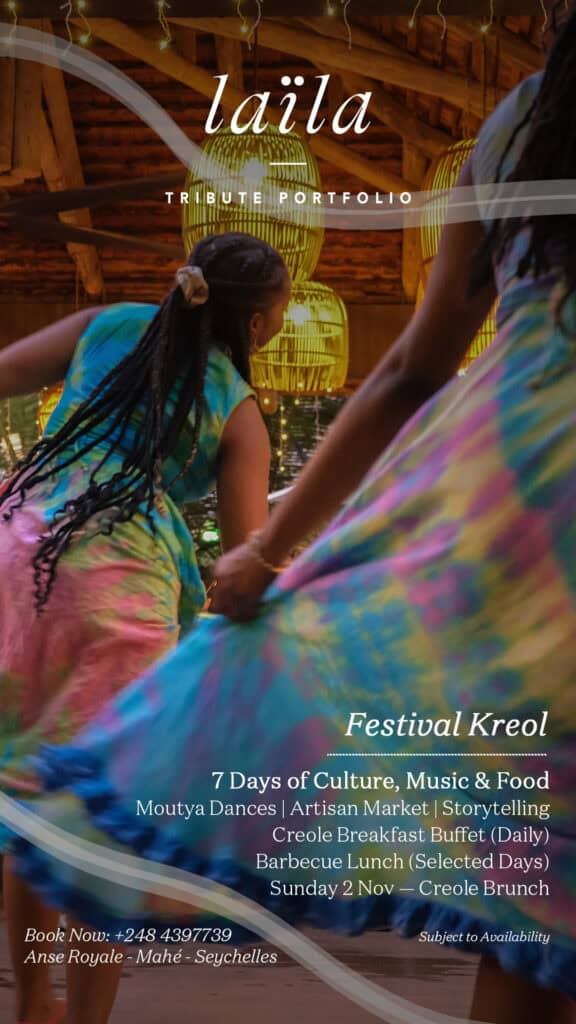 Celebrate Seychelles’ vibrant Festival Kreol at laïla, Tribute Portfolio, in Anse Royale, Mahé. Immerse yourself in a full week of Creole culture — from lively Moutya dances and fascinating storytelling sessions to the colorful artisan market showcasing authentic local crafts.