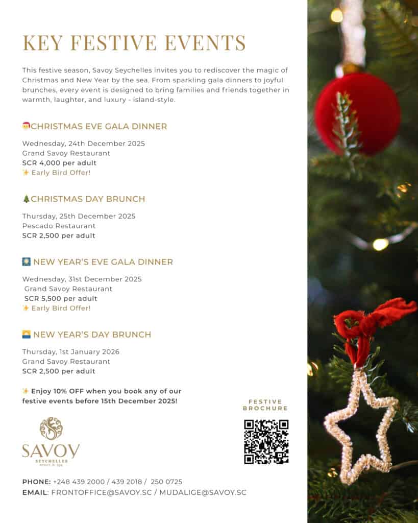 Discover Savoy Seychelles’ festive programme filled with gala dinners, Christmas brunch, and New Year celebrations. Enjoy delicious dining, a relaxed island atmosphere, and early bird savings when you book before