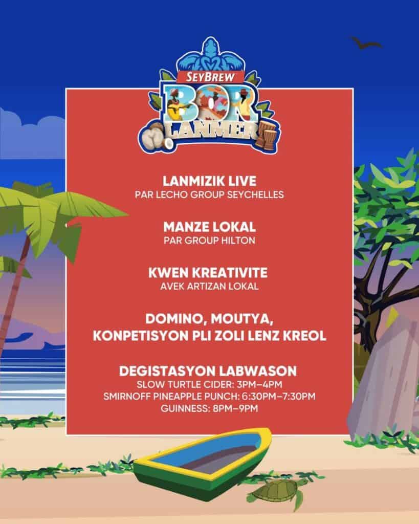 Nou pe anmenn ankor sa labyans, sa bon gou kreol, e sa selebrasyon nou kiltir pour dezyenm parti Seybrew Bor Lanmer. Ou pa anvi mank sa enn. Ou lazournen pour ranpli avek plizyer aktivite: