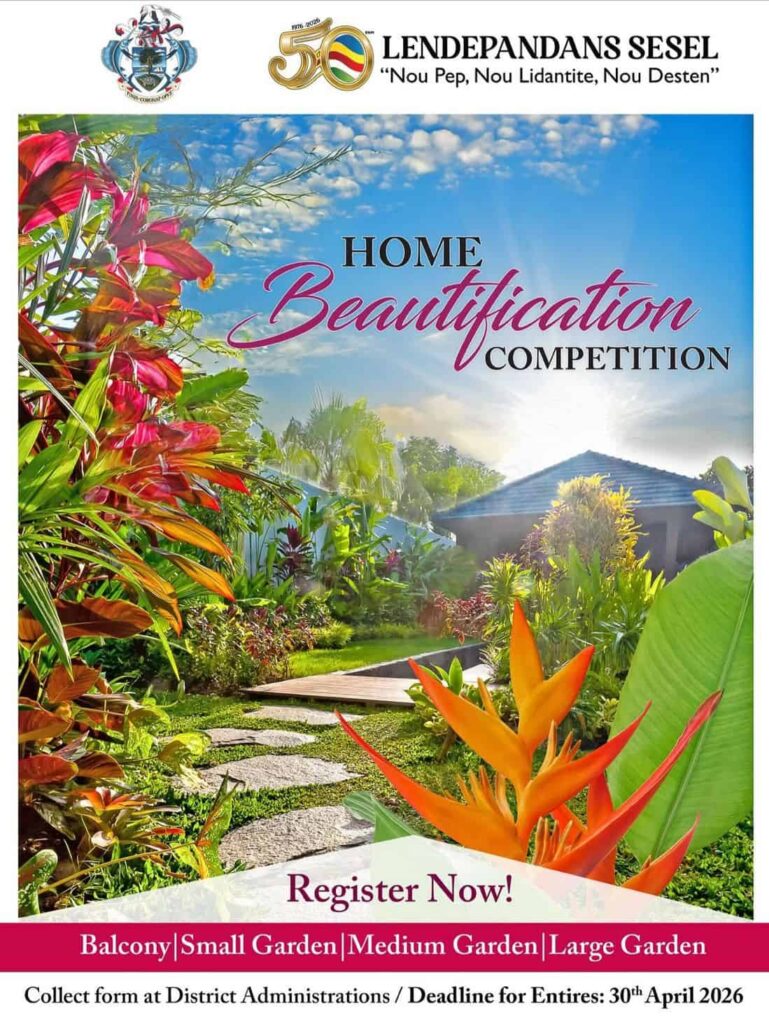 The National Day Celebrations Committee has officially launched the Home Beautification Competition, a friendly, community-driven initiative that encourages households across the islands to enhance their surroundings. Whether it’s a splash of tropical colour on a balcony or a carefully designed garden oasis, every effort contributes to a more beautiful and united Seychelles.