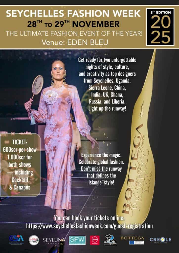 Hosted at the elegant Eden Bleu Hotel, this year’s show brings together designers from Seychelles, Uganda, Sierra Leone, China, India, the UK, Ghana, Russia, and Liberia. Expect bold statements, fresh ideas, and designs that tell stories from across the globe… all with the atmosphere and flair that only Seychelles can offer.