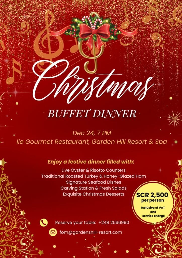 What’s On Mahé? Christmas Buffet Dinner 🕗 7 PM till late📍Gardens Hill Resort & Spa – Beau Vallon💰 scr 2500 pp