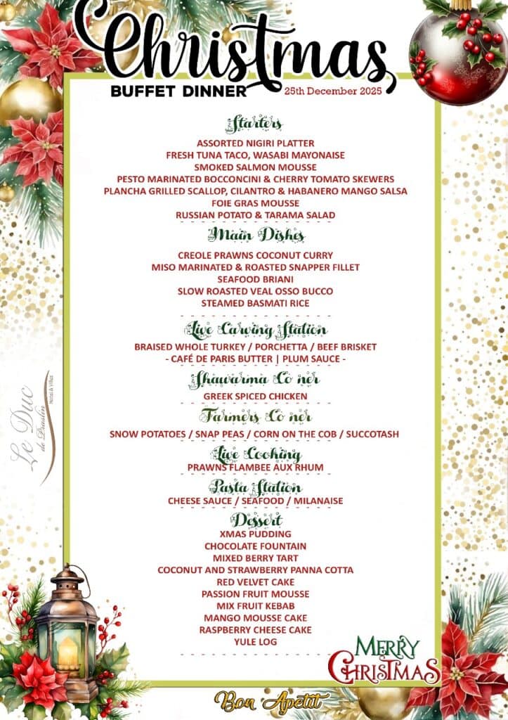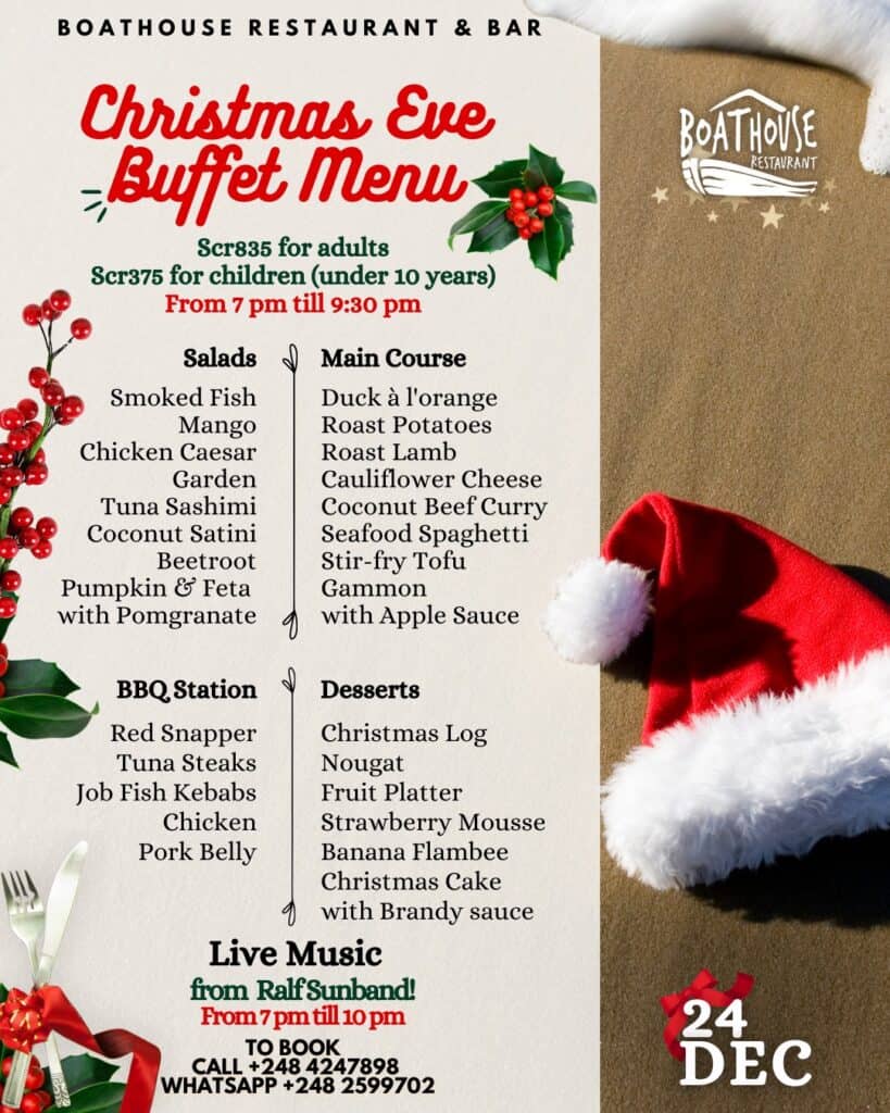 What’s On Mahé? Christmas Eve Buffet 🕗 7 PM till 9:30PM📍Boat House Restaurant – Mahé💰 scr835 adults/scr375 kids