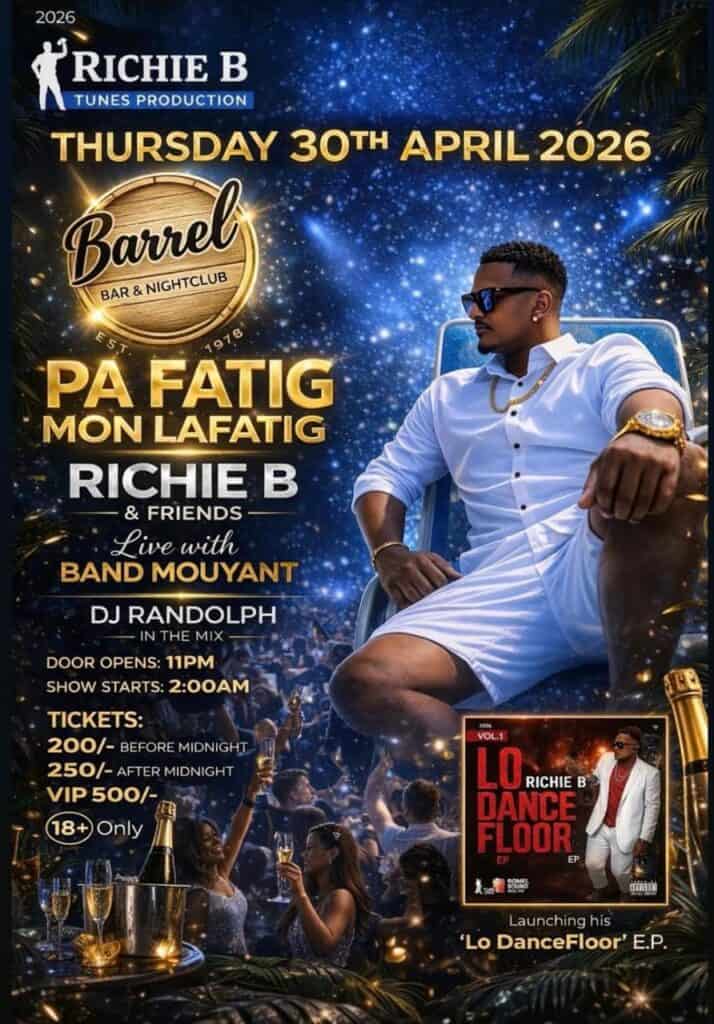 What’s On Mahé? Richie B & Friends 🕗 Doors open 11PM📍Barrel in Victoria Town Entry Fee – SCR200 b4 midnight and SCR 250 after 🔞