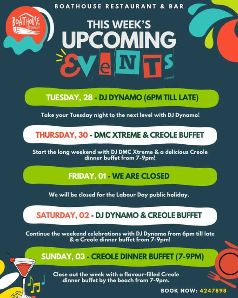 What’s On Mahé? Creole Buffet and DJ Dynamo🕗 7PM-9PM📍Boat House Restaurant – Beau Vallon💰SCR615/-pp Buffet (Free Entrance)