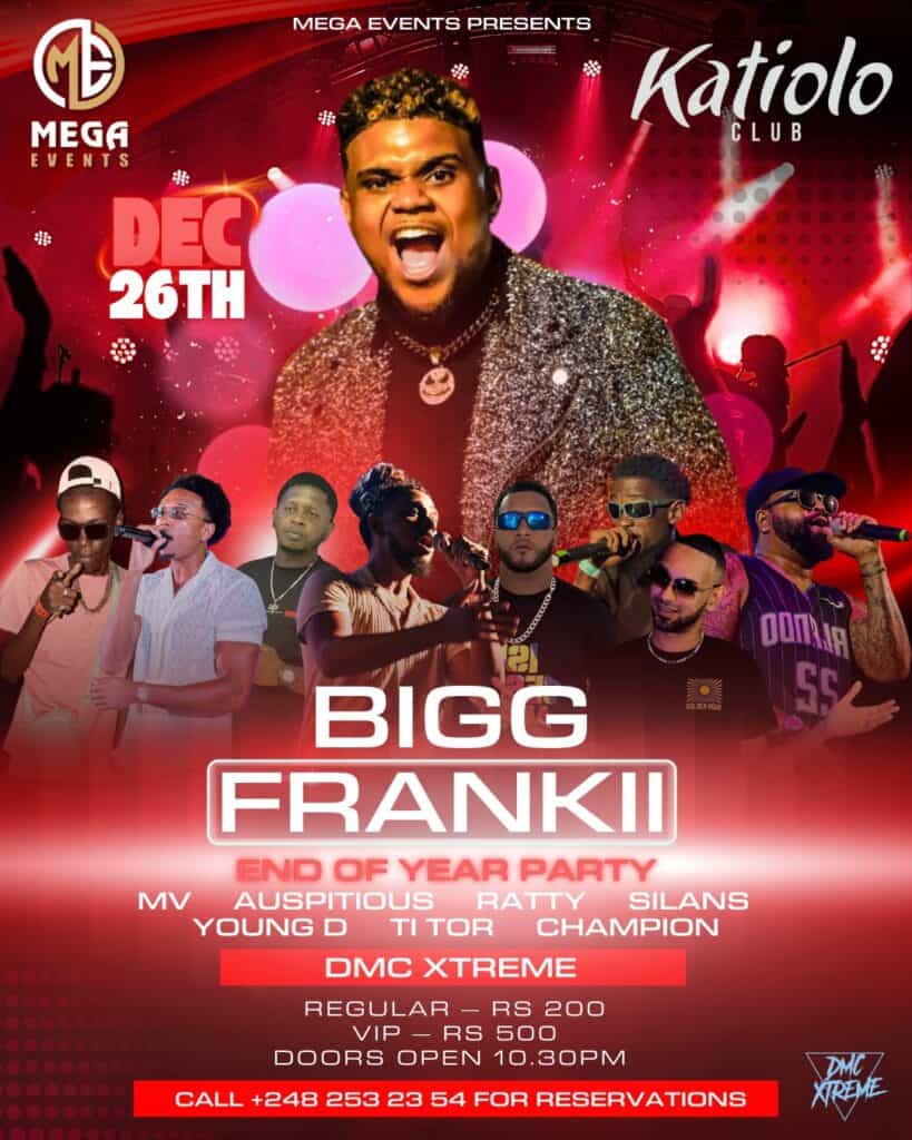 What’s On Mahé? Bigg Frankii End of Year Party! 🕗 9PM till late📍 Katiolo club 💰from scr200