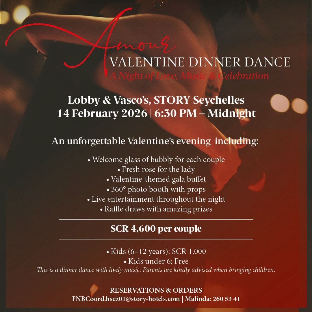 What’s On Mahé? Valentine’s Dinner Dance 🕗 6:30pm – 12AM📍Story, Beau Vallon 💰scr4,600 per couple