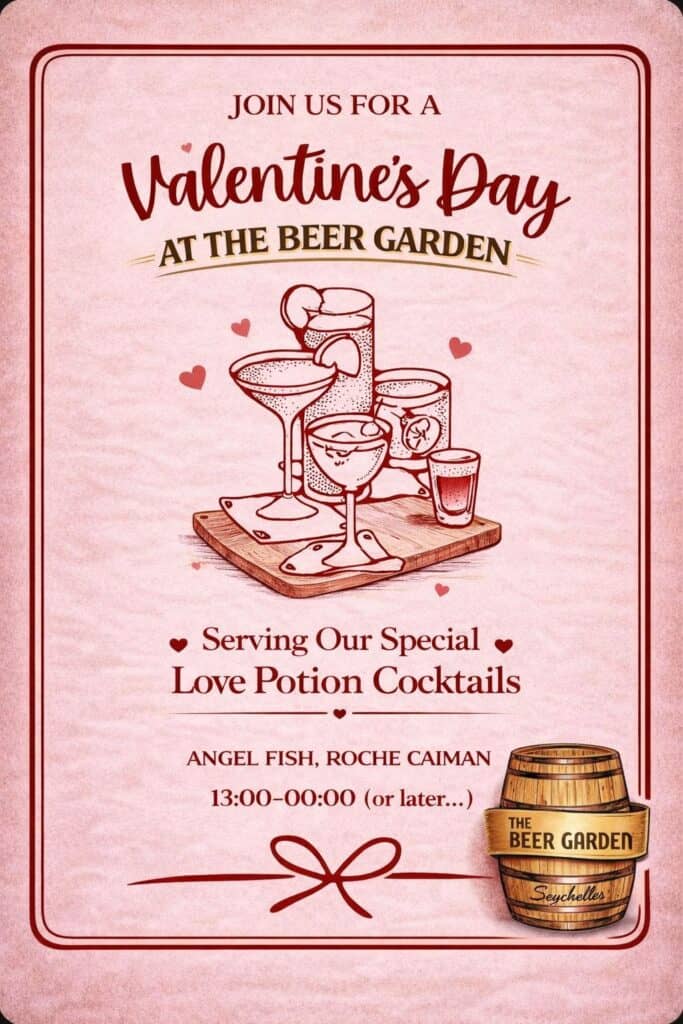 What’s On Mahé? Valentine’s at Angel Fish 🕗 1PM – Late📍The Beer Garden, Angel Fish, Roche Caiman 💰Free entry