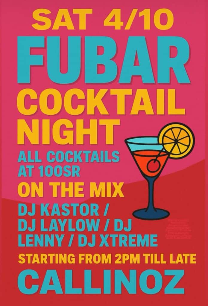 What’s On Mahé? Cocktail Night 🕗 2 PM TILL LATE 📍Fubar – Callinoz – Victoria, Mahe💰 Free Entrance🔞