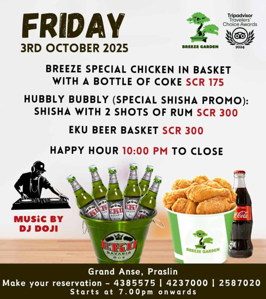 What’s On Praslin? Breeze Friday🕗 7 PM onwards📍Breeze Garden – Grand Anse Praslin 💰Free Entry!