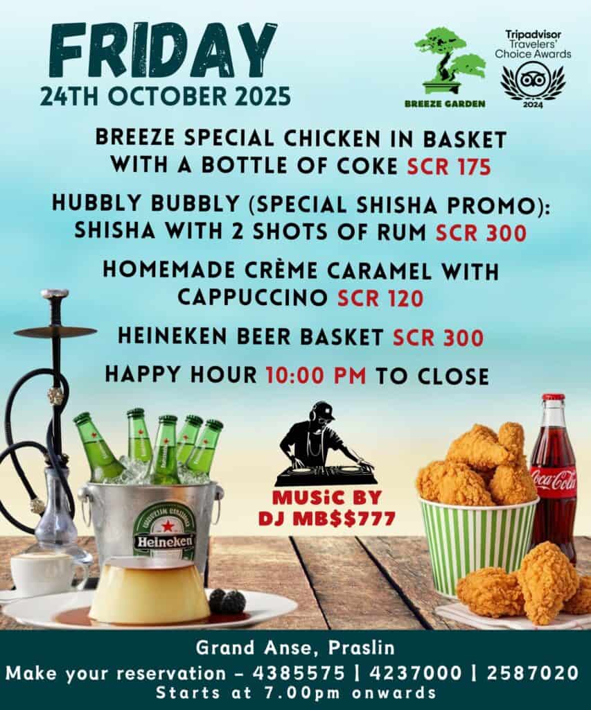What’s On Praslin? Breeze Friday🕗 7 PM onwards📍Breeze Garden – Grand Anse Praslin 💰Free Entry!