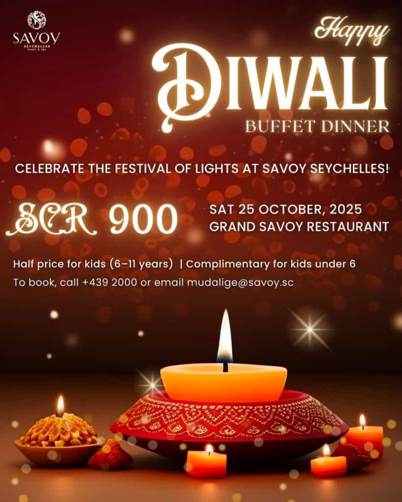What’s On Mahé? Diwali Buffet Dinner 🕗Book now 📍Savoy – Beau Vallon💰SCR900/- per adult