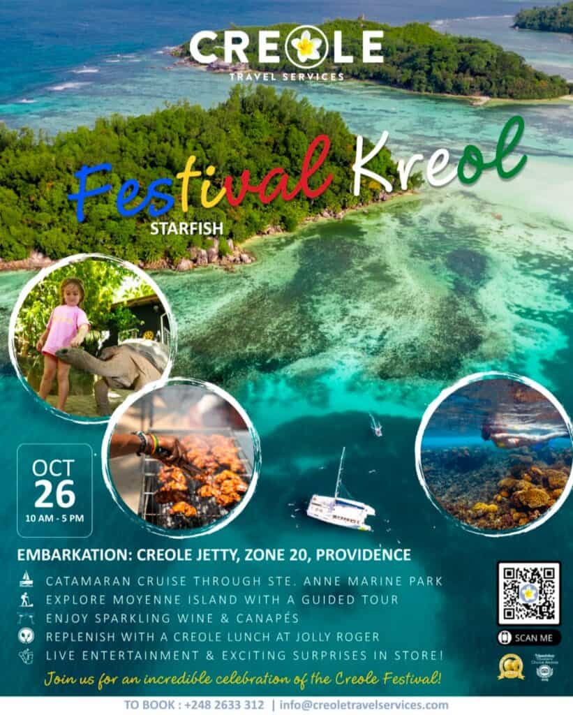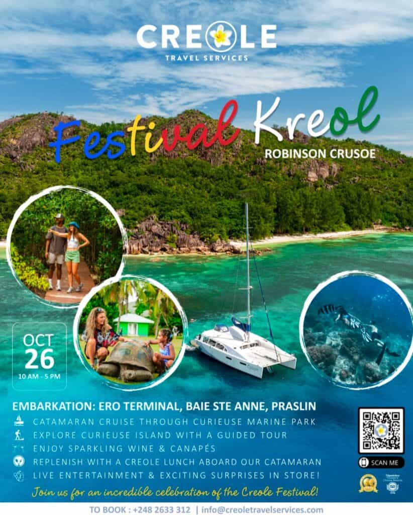 What’s On Mahé and Praslin? Festival Creole Cruises 🕗 10 AM – 5 PM 📍Embarkation: Providence Zone 20 and Baie St Anne – Praslin💰 SCR450/- per adult