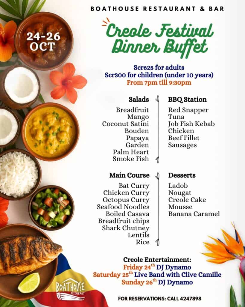 What’s On Mahé? Creole Festival Dinner Buffet 🕗Friday till Sunday with Entertainment – 7 PM – 9:30 PM📍Boat House Restaurant – Beau Vallon💰 SCR 625/- per adult SCR 300/- for kids under 10 years