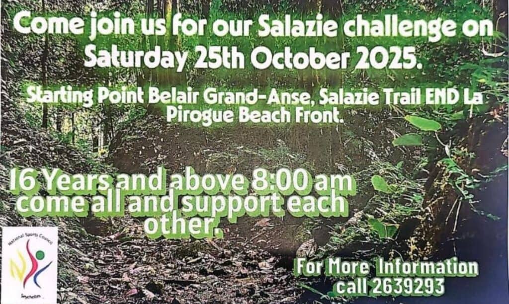 What’s On Mahé? Salazie Challenge 🕗 8 am start 📍Starting point at Belair Grand-Anse, Salazie Trail END /Pirogue Beach Front.💰Free – 16 plus years