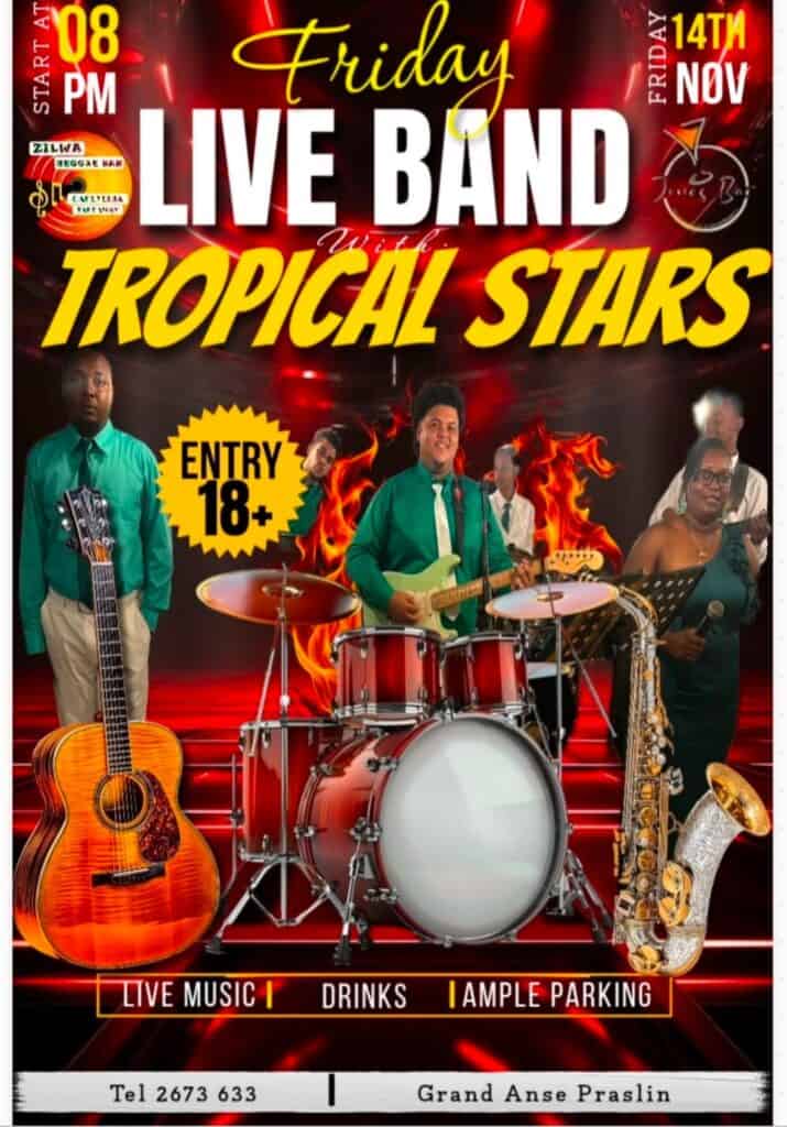 What’s On Praslin? Tropical Star🕗 7 PM onwards📍Zilwa Reggae Bar – Grand Anse Praslin 💰Free Entry!🔞