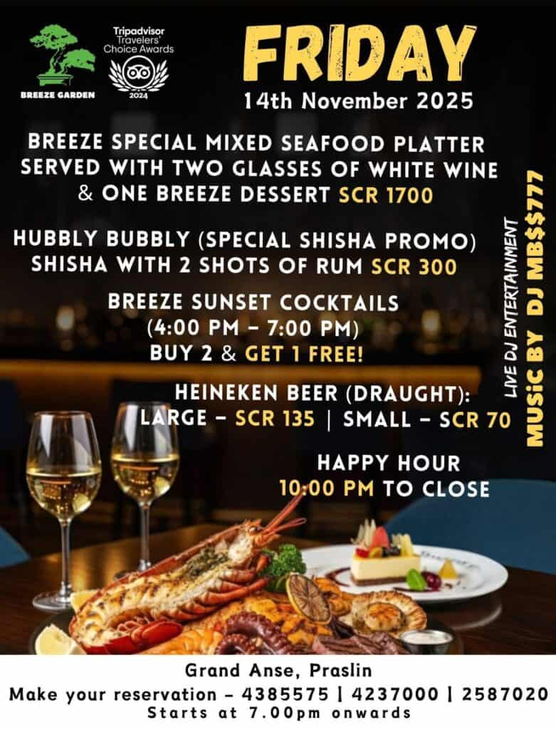 What’s On Praslin? Breeze Friday🕗 7 PM onwards📍Breeze Garden – Grand Anse Praslin 💰Free Entry!