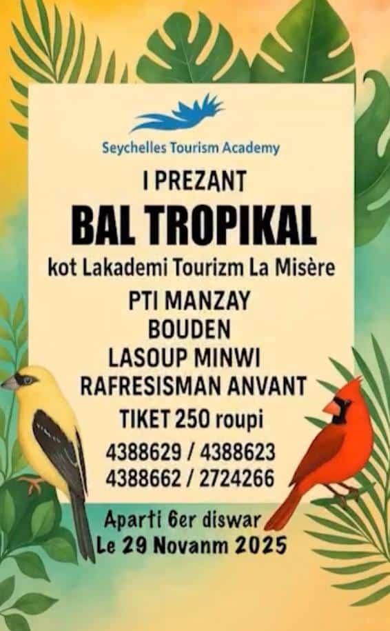 What’s On Mahé? Bal Tropikal 🕗 6 PM – 1AM 📍Seychelles Tourism Academy💰 scr 250 per ticket