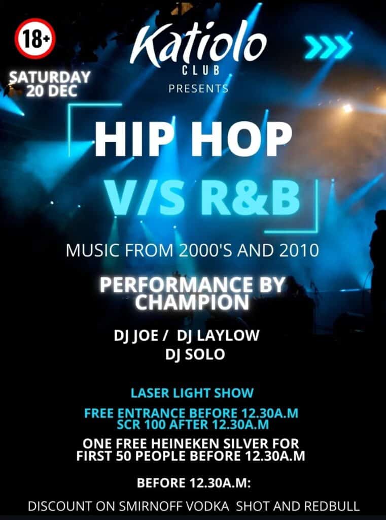 What’s On Mahé? Hip Hop vs R&B🕗 Doors open 10/11PM 📍Katiolo in Au Cap💰 From SCR1oo/- after 12:30 am 🔞