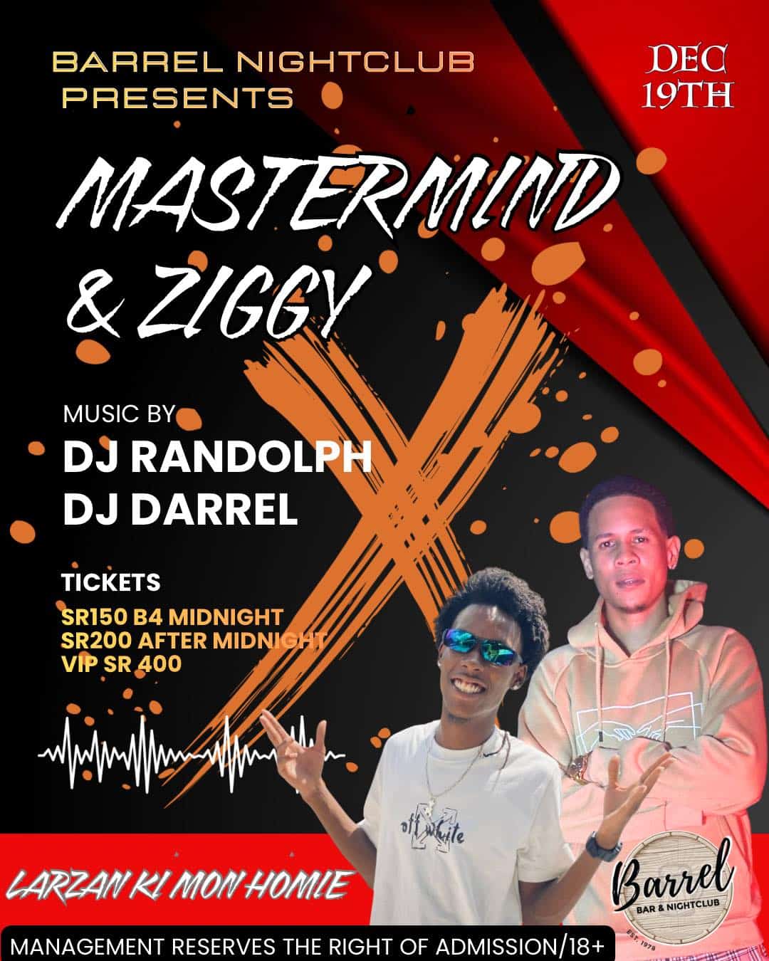 On Mahé? Mastermind & Ziggy 🕗 8 PM till late📍Barrel Nightclub – Victoria💰 from scr 150🔞