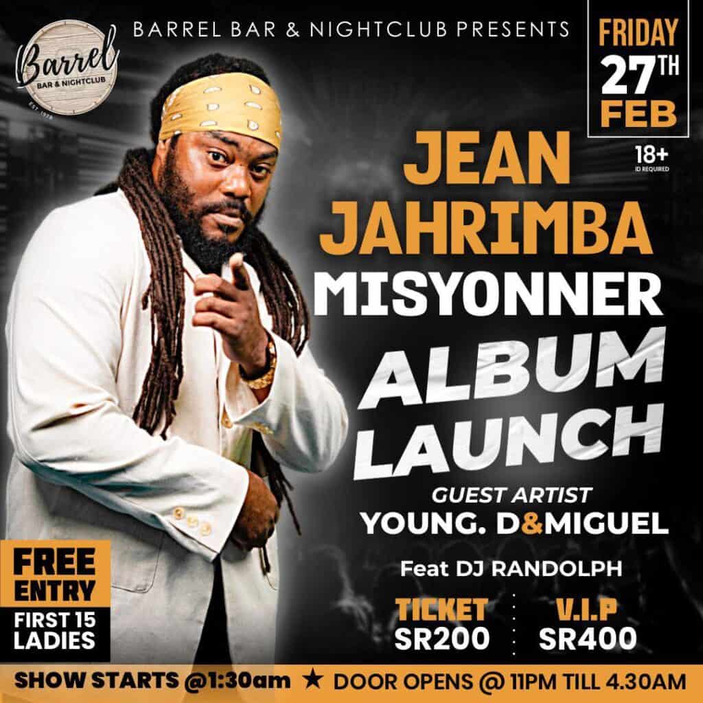 What’s On Mahé? Jean Jahrimba Album Launch 🕗 11PM – late 📍Barrel Nightclub💰 scr200