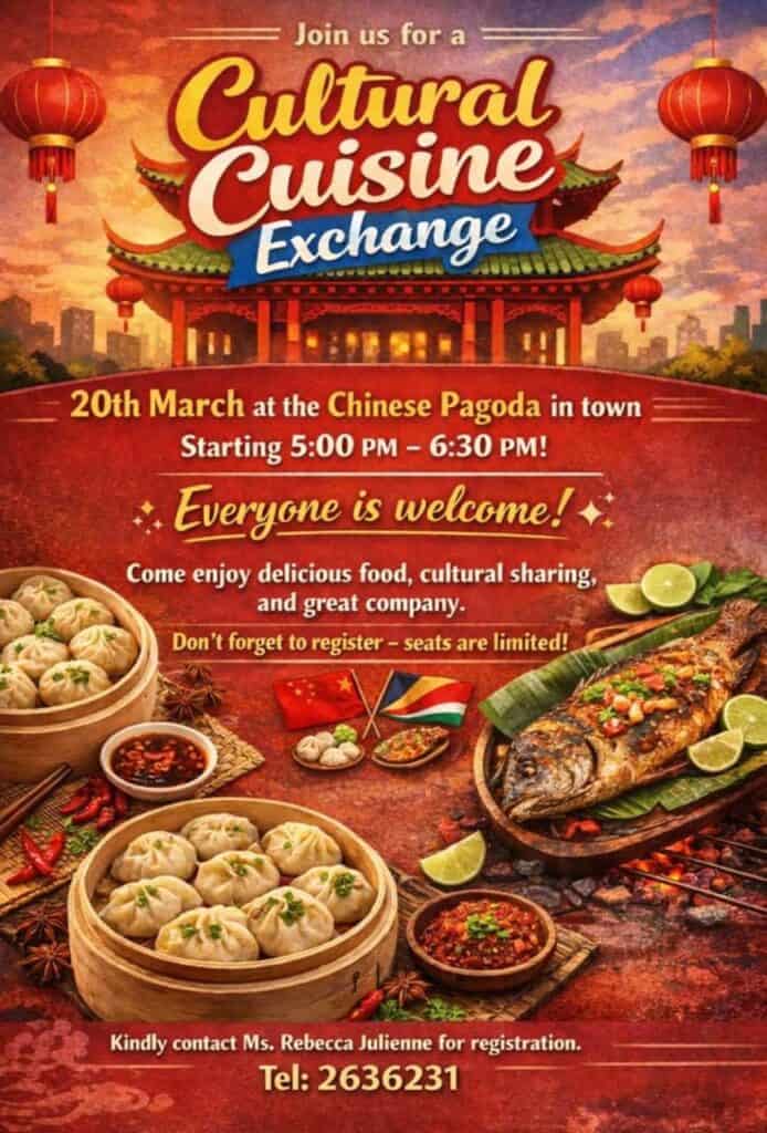 What’s On Mahé? Cultural Cuisine Exchange 🕗 5 PM – 6:30PM 📍Chinese Pagoda Everyone is welcome! Register +2482636231