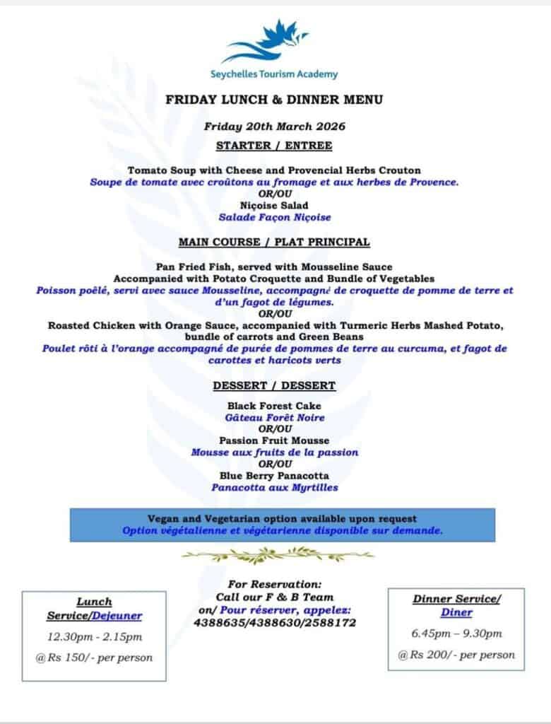 What’s On Mahé? Friday Lunch and Dinner Menu 🕗 Lunch 12:30-2:15PM Dinner 6:45-9:30PM 📍Seychelles Tourusm Academy Call to reserve SCR150/- Lunch to SCR200/- Dinner