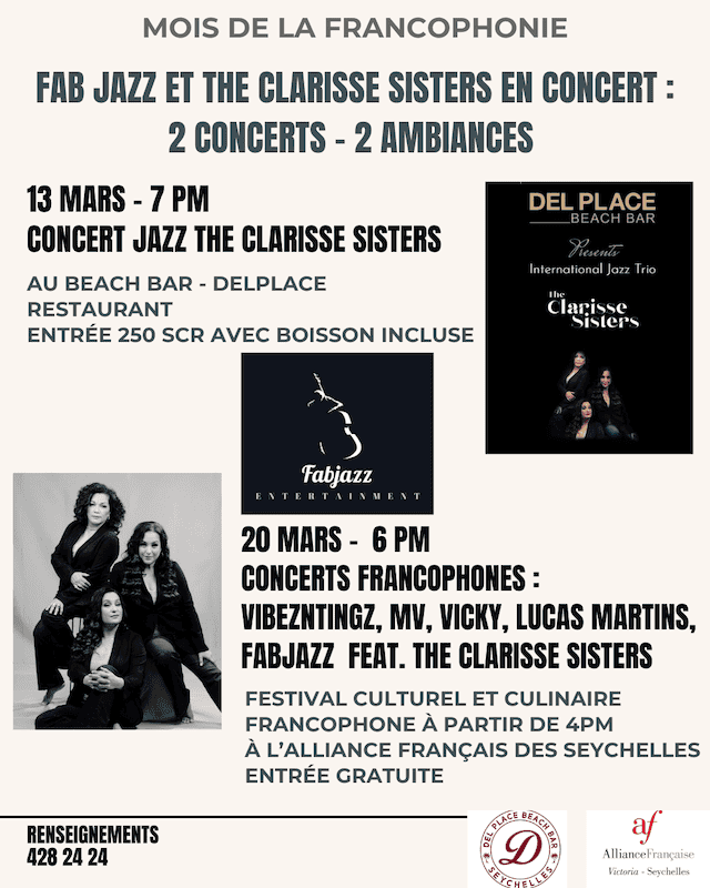 What’s On Mahé? Francophone Concerts with Fabjazz feat. The Clarisse Sisters 🕗 Entertainment starts 6PM 📍Alliance Française of Seychelles Free