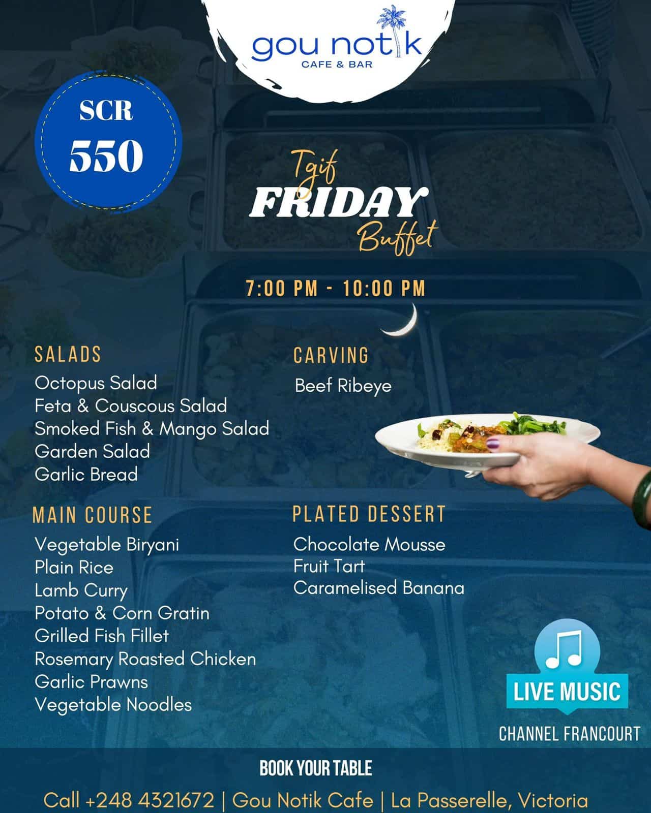 What’s On Mahé? Buffet and Live Music🕗 7PM-10PM📍Gou Notik, Café and Bar💰 SCR 550/- per person