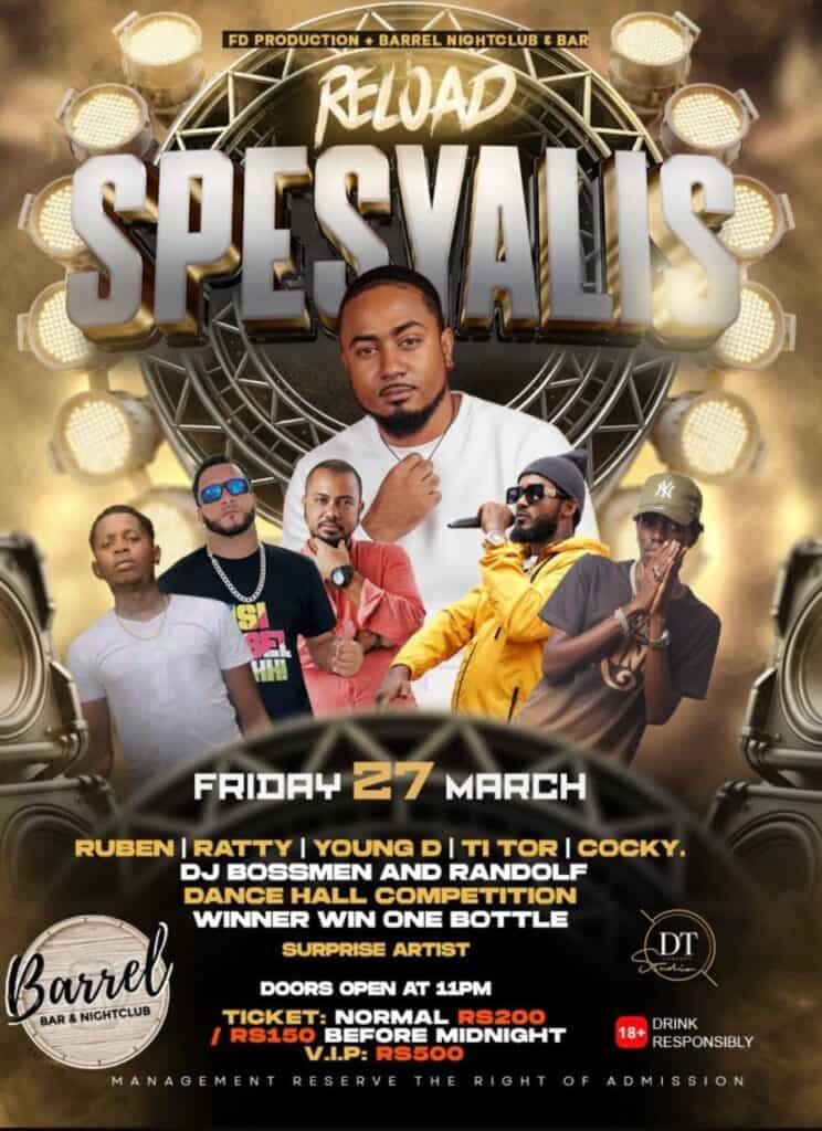 What’s On Mahé? Spesyalis 🕗 11PM – late 📍Barrel in Victoria Town SCR150 before 12 AM / SCR200🔞