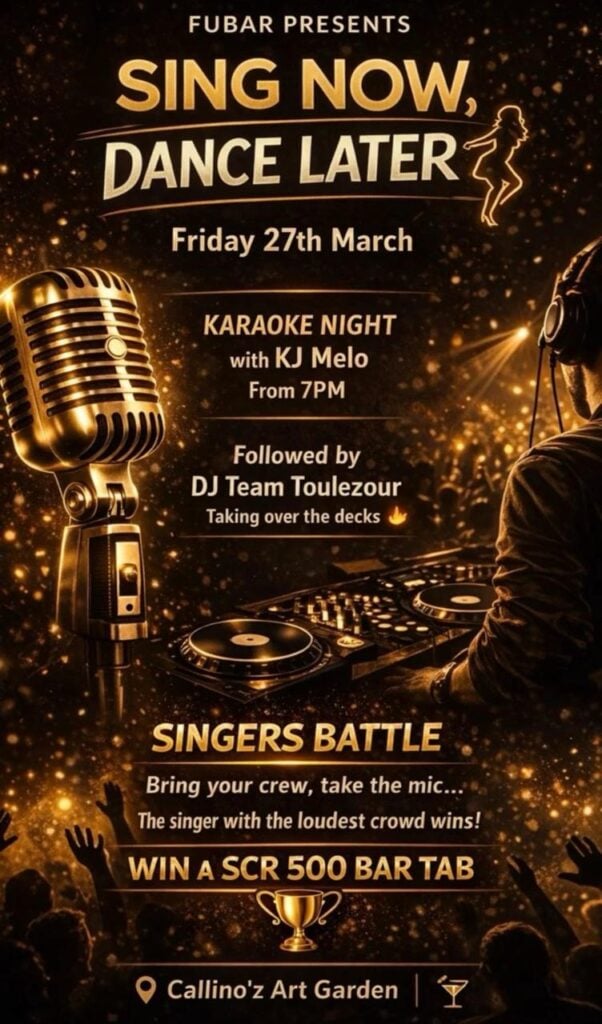 What’s On Mahé? Sing now and dance later🕗 7PM-late📍Fubar – Callino’z Art Garden 💰Free Entrance 🔞