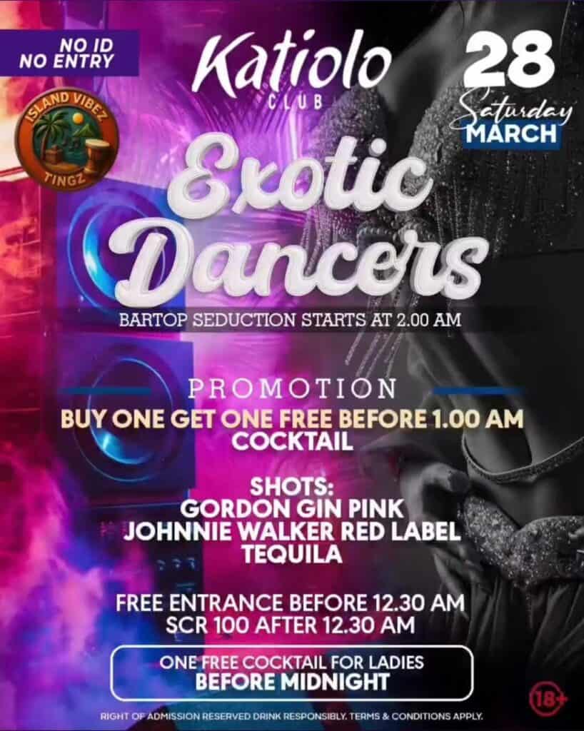 What’s On Mahé? Exotic 🕗 11PM – late 📍Katiolo – Au Cap Free before 12:30 AM – SCR100/- after 🔞