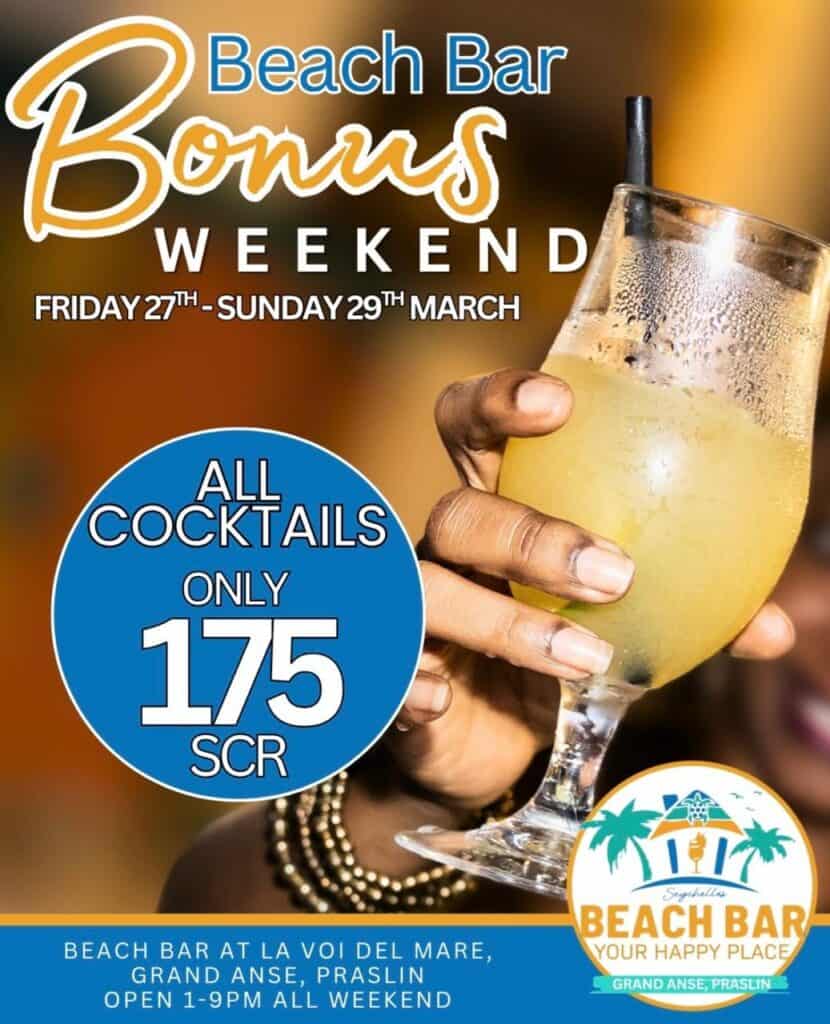 What’s On Praslin? Beach Bar Bonus 🕗 1pm-9pm📍Beach Bar at La Voi Del Mare – Grand Anse Praslin