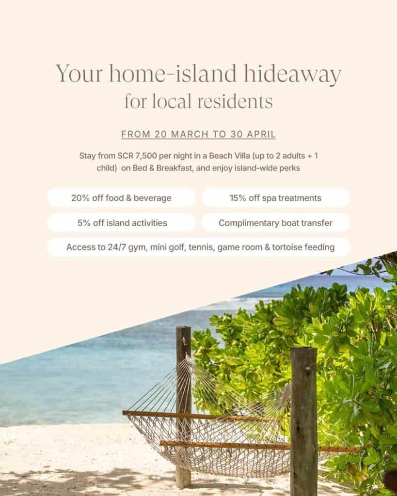 Escape to Niva Labriz with an exclusive resident offer — stay in a Beach Villa for just SCR 7,500 per night on a bed & breakfast basis (2 adults + 1 child).🏝️