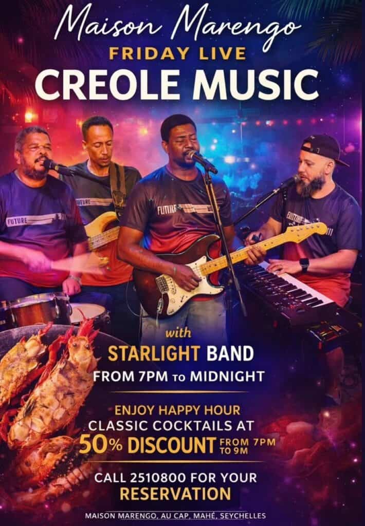 What’s On Mahé? Creole Music🕗 7PM-12AM📍Maison Marengo – Au Cap💰Free Entrance 🔞on drink promos